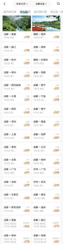 其中,成都至桂林、恩施、丽江、杭州等地机票最低200元左右;成都至大理、西安、深圳、上海、贵阳、合肥、沈阳、拉萨等近20个城市,单程最低票价不超过300元。