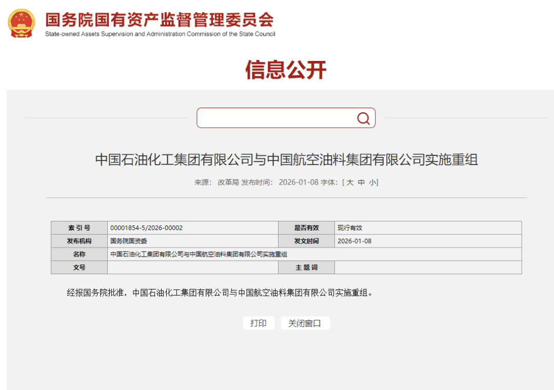 经报国务院批准,中国石油化工集团有限公司与中国航空油料集团有限公司实施重组。