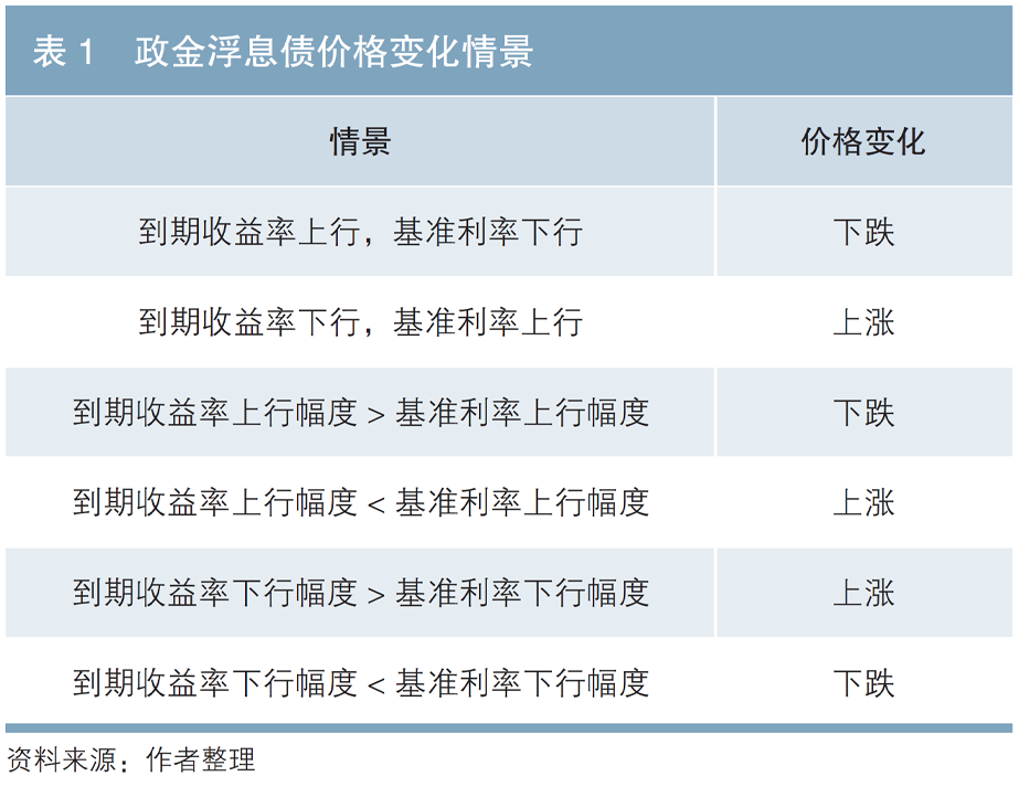 政金浮息债票面利率包括两部分:基准利率和利差。票面利率在利率调整日随所参考基准利率的变动而调整。根据全国银行间债券市场债券到期收益率计算标准和中债估值计算公式,政金浮息债全价受两方面因素影响:一是分子部分的未来基准利率变动,二是分母部分的到期收益率变动。当基准利率与到期收益率同步变化且幅度相当时,价格基本保持不变。当基准利率与到期收益率反向变化时,价格涨跌也相对确定。当基准利率与到期收益率同向变动但幅度不同时,价格涨跌取决于相对变化幅度(见表1)。