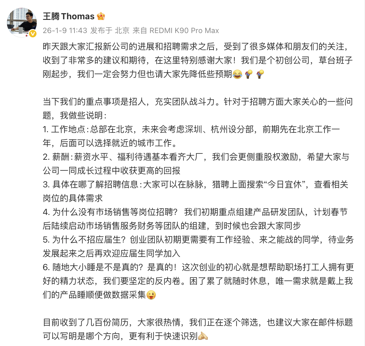 1月9日,原小米中国区市场部总经理、REDMI品牌总经理王腾在官宣成立新公司“今日宜休”后,针对于招聘方面大家关心的一些问题做出说明。王腾表示,公司初期重点组建产品研发团队,计划春节后陆续启动市场销售服务财务等团队的组建。而针对为何不招应届生,他表示,“创业团队初期更需要有工作经验、来之能战的同学,待业务发展起来之后再欢迎应届生同学加入。”