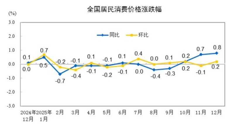 2025年12月,CPI同比涨幅比上月扩大0.1个百分点至0.8%,回升至2023年3月份以来最高。