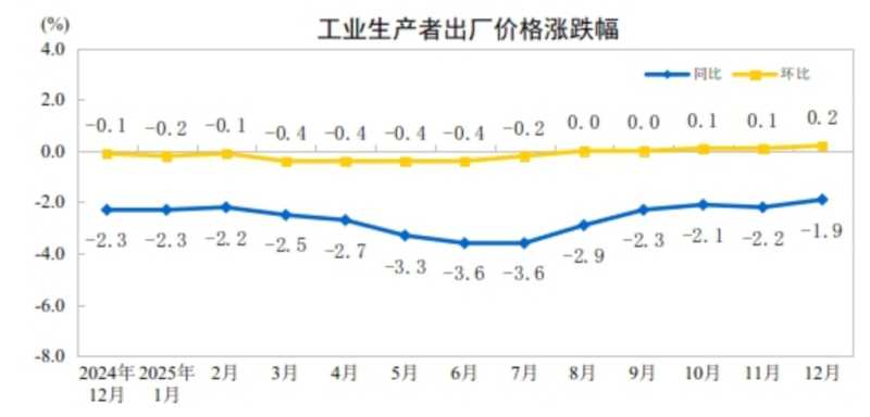 2025年12月,PPI同比下降1.9%,降幅比上月收窄0.3个百分点。