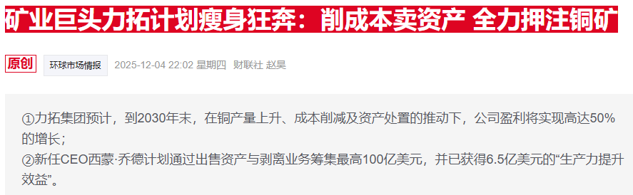 上月,力拓集团预计,在新任CEO西蒙·乔德(Simon Trott)的带领下,到2030年末,公司盈利将在铜产量上升、成本削减及资产处置的推动下实现高达50%的增长。