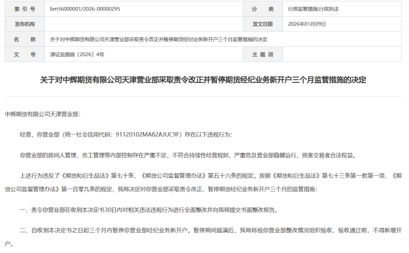 1月9日,天津证监局发布关于对中辉期货天津营业部采取责令改正并暂停期货经纪业务新开户三个月监管措施的决定。而在此前,恒泰期货青岛营业部也在这周二被青岛证监局采取责令改正并暂停期货经纪业务新开户三个月监管措施的决定。