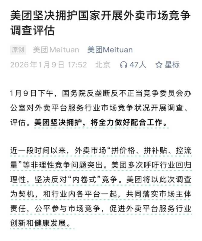 美团表示,坚决拥护,将全力做好配合工作。美团多次呼吁行业回归理性,坚决反对“内卷式”竞争。美团将以此次调查为契机,和行业内各平台一起,共同落实市场主体责任,公平参与市场竞争,促进外卖平台服务行业创新和健康发展。