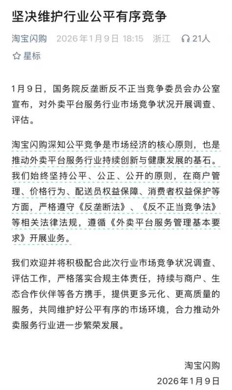 淘宝闪购表示,坚决维护行业公平有序竞争,欢迎并将积极配合此次行业市场竞争状况调查、评估工作,严格落实合规主体责任,持续与商户、生态合作伙伴等各方携手,提供更多元化、更高质量的服务,共同维护好公平有序的市场环境,合力推动外卖服务行业进一步繁荣发展。