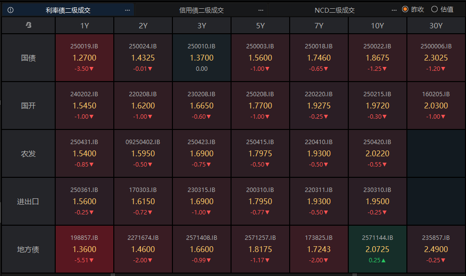 截至今日17:30,利率市场收益率多数下行,10Y国债下行1.15bp至1.87%,30Y国债下行1.25bp至2.30%。信用市场收益率多数下行,2Y期AAA信用债下行1bp至1.71%。债市早盘下跌。资金面中性,资金情绪指数48,资金价格较昨日震荡,DR001在1.28%附近,DR007在1.50%附近。