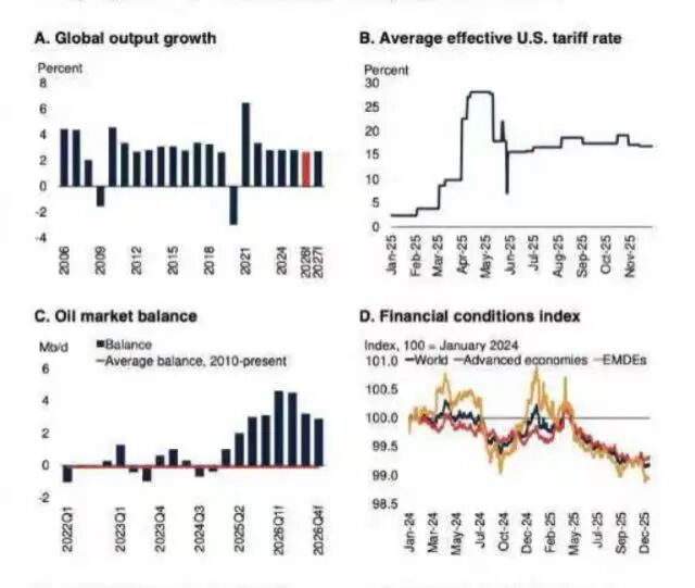 不过报告认为,全球金融条件趋于宽松及多个大型经济体的财政扩张应有助于缓冲经济下行。受劳动力市场趋软及能源价格下降影响,预计2026年全球通胀将微降至2.6%。随着贸易流动逐步适应现状且政策不确定性减弱,2027年经济增速有望回升。