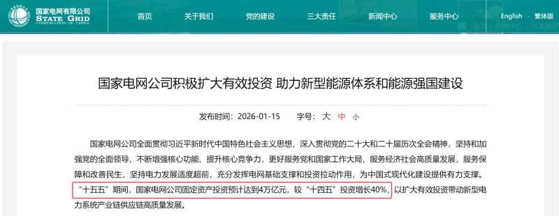 1月15日,国家电网官网发布消息称,“十五五”期间,国家电网公司固定资产投资预计达到4万亿元,较“十四五”投资增长40%,以扩大有效投资带动新型电力系统产业链供应链高质量发展。
