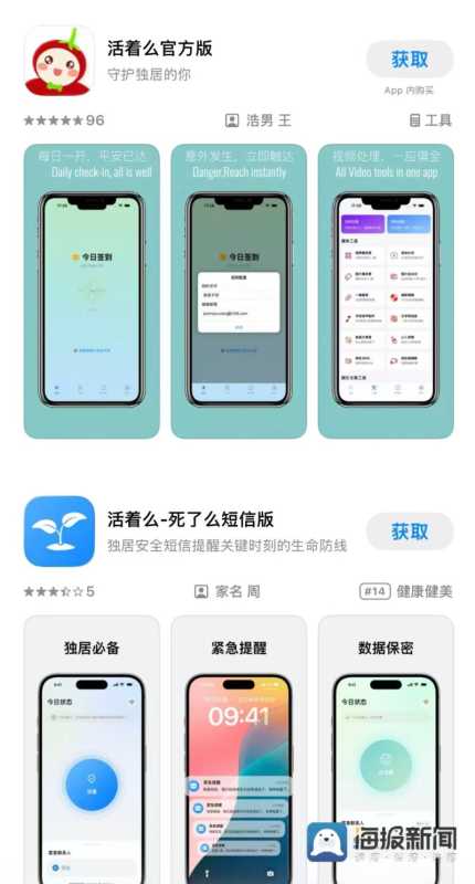 1月15日,近期火热的独居人群安全APP“死了么”突然下架,海报新闻记者在苹果应用商店、安卓搜索发现,类似的独居安全提醒APP仍能下载。