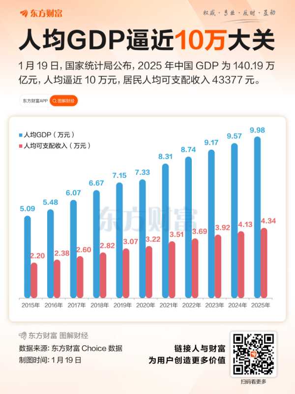 2025年年末全国人口(包括31个省、自治区、直辖市和现役军人的人口,不包括居住在31个省、自治区、直辖市的港澳台居民和外籍人员)140489万人,比上年末减少339万人。以此计算,2025年我国人均GDP为9.98万元,距10万元整数大关仅一线之隔。