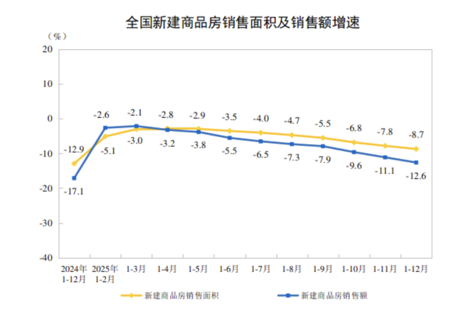 国家统计局数据显示,2025年,全国新建商品房销售面积88101万平方米,同比下降8.7%;其中住宅销售面积73299万平方米,同比下降9.2%。