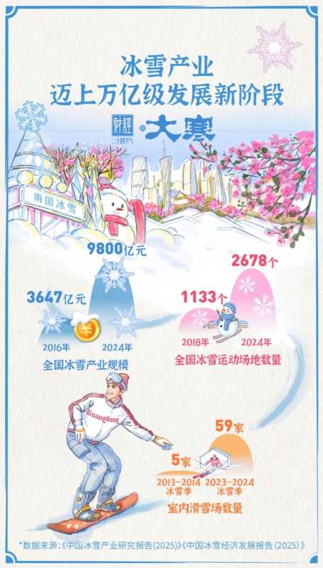 数据显示,2025年我国冰雪产业规模预计达10053亿元,我国冰雪运动场地从2018年的1133个增长至2024年底的2678个。室内滑雪场爆发式增长,数量从2013—2014冰雪季的5家猛增至2023—2024冰雪季的59家,主要分布于南方城市。