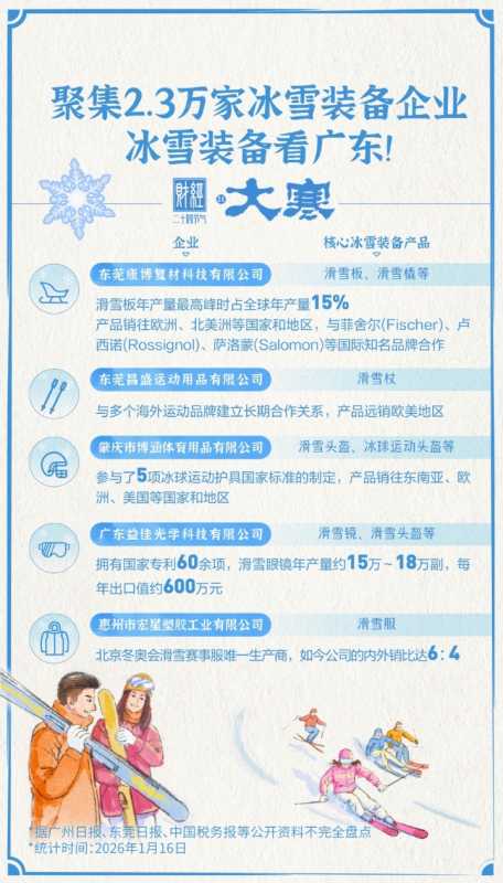 天眼查专业版数据显示,我国现有处于在业、存续状态的冰雪装备相关企业达9.3万余家,其中,广东以约2.3万家的数量领跑全国,覆盖滑雪服装、防护装备、滑雪板及滑雪杖等核心品类。东莞作为“世界工厂”代表,涌现出一批龙头企业。制造基础与应用场景相互促进,使冰雪经济在广东不仅“落地成景”,也“生根成链”。