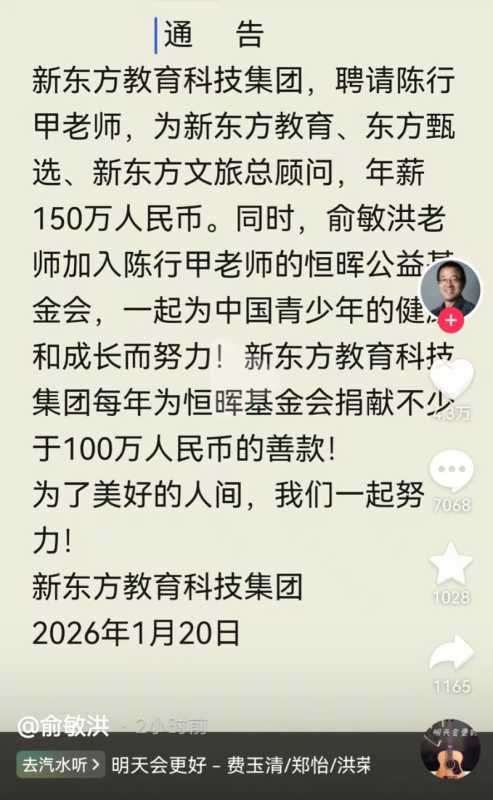 1月20日,新东方创始人俞敏洪在自己个人抖音号,以新东方教育科技集团名义发布了一则通告:“新东方教育科技集团,聘请陈行甲老师,为新东方教育、东方甄选、新东方文旅总顾问,年薪150万人民币。”通告还表示,新东方教育科技集团每年为恒晖基金会捐献不少于100万人民币的善款。
