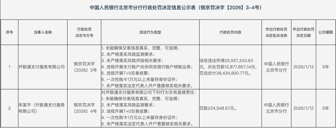 1月21日,中国人民银行北京市分行公布的最新行政处罚公示信息显示,开联通支付服务有限公司(下称“开联通支付”)因违规开展T+0交易结算等七项违法违规行为,被没收违法所得2555.72万元,并处罚款1287.77万元,罚没合计3843.49万元。