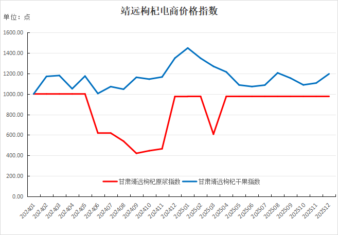 本期靖远枸杞电商价格指数小幅上涨。截至2025年12月,枸杞原浆价格指数报976.19点,较上期(11月,下同)环比持平,较基期下跌23.81点,跌幅2.38%。枸杞干果价格指数报1195.47点,较上期上涨89.27点,涨幅8.07%,较基期上涨195.47点,涨幅19.55%。