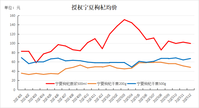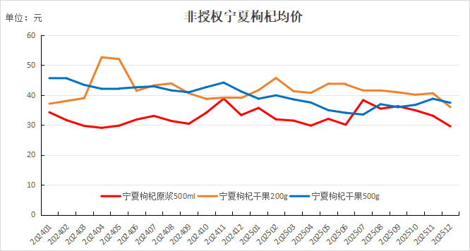 截至2025年12月,授权枸杞原浆500ml均价为99.63元,环比下跌2.85%;授权枸杞干果200g均价为48.20元,环比下跌5.84%;授权枸杞干果500g均价为67.19元,环比上涨4.83%。非授权枸杞原浆500ml均价为29.52元,环比下跌10.68%;非授权枸杞干果200g均价为35.93元,环比下跌4.62%;非授权枸杞干果500g均价为37.38元,环比下跌3.45%。