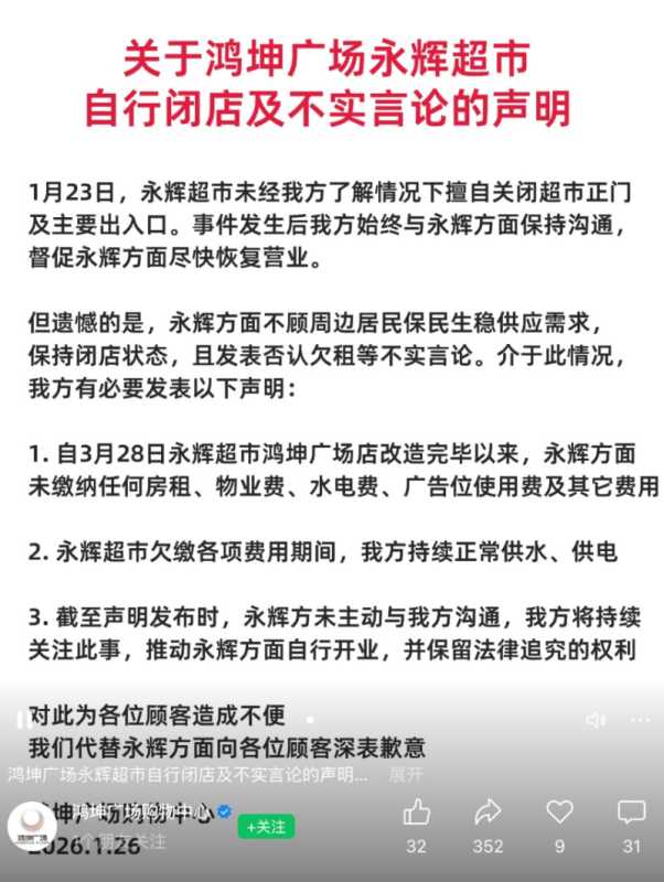 1月26日,就永辉北京一调改门店突然停业一事,北京鸿坤广场购物中心发布声明称,“1月23日,永辉超市未经我方了解情况下擅自关闭超市正门及主要出入口。事件发生后我方始终与永辉方面保持沟通督促永辉方面尽快恢复营业。”该购物中心表示,自永辉超市鸿坤广场店改造完毕以来,永辉方面未缴纳任何房租、物业费、水电费、广告位使用费及其它费用。永辉超市欠缴各项费用期间,购物中心持续正常供水、供电。