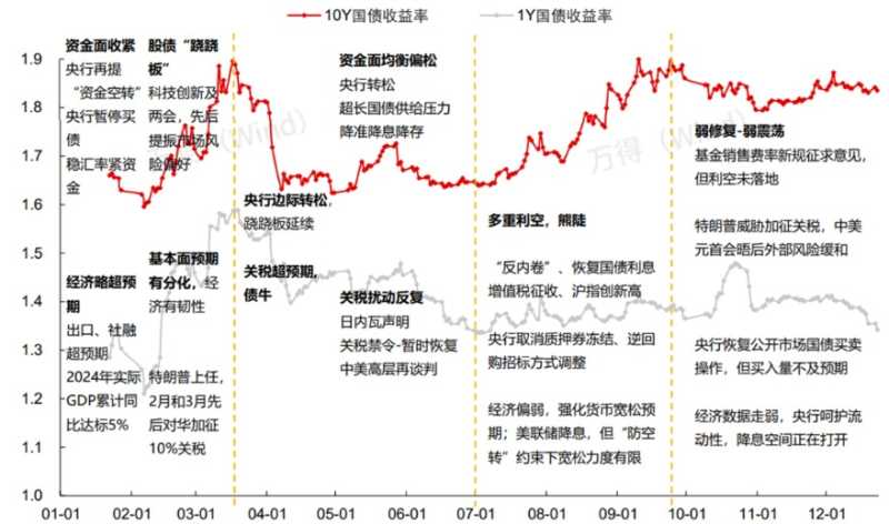 进入二季度后,受关税扰动影响,利率市场迎来一波行情。到了三季度,在“反内卷”的背景下,股市走势偏强,出现了反内卷股债跷跷板效应,叠加市场对再通胀的交易行为,债券利率再度上行。整个四季度则呈现偏弱震荡态势,此前的反内卷、股债跷跷板等效应对债券市场的影响出现一定边际钝化,但同时也存在费率新规等不确定性因素的扰动。