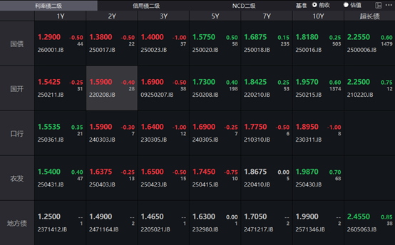 资金面方面,Shibor短端品种表现分化。隔夜品种上行0.2BP报1.368%;7天期上行4.5BP报1.572%;14天期下行0.5BP报1.591%;1个月期下行0.26BP报1.552%。