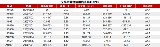 交易所债券市场收盘,据Choice 数据统计显示,今日交易所市场非金信用债涨幅排行前五的分别是:H0中骏02、21万科04、22万科02、22万科04、23万科01。具体如下: