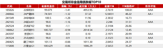 据Choice 数据统计显示,今日交易所市场非金信用债跌幅排行前五的分别是:22保利03、24产融08、24华电K4、24延长K1、25兖矿K2。具体如下: