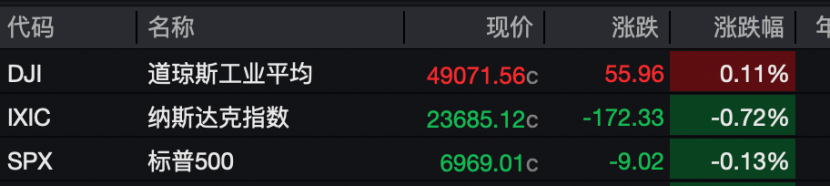 当地时间1月29日,美股三大指数涨跌不一,纳斯达克指数跌0.72%,标普500指数跌0.13%,道琼斯指数涨0.11%,大型科技股涨跌互现,纳斯达克中国金龙指数涨0.35%。