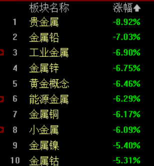 黄金市场这场资本风暴迅速蔓延股市。1月30日,A股三大指数集体低开,黄金板块领跌,同花顺黄金板块指数跌幅一度超9%,有9只黄金股跌停。同时,贵金属板块的下跌,也带动工业金属板块的下跌:同花顺工业金属指数下跌近7%,金属铜指数下跌超6%。