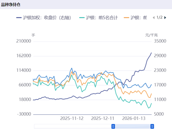 相较而言,国内白银期货多、空持仓量前5名的净持仓在1月27日一度降至净空头为主,净空头持仓量为9377手。不过在随后的两个交易日有所回升,1月28日多、空持仓量前5名净空头持仓6230手,1月29日净多头持仓6929手。