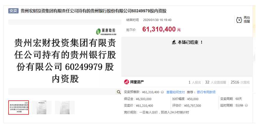 据阿里司法拍卖网络平台信息,因建设工程合同纠纷,贵州省六盘水市中级人民法院于2025年对贵州宏财投资集团持有的约6025万股贵州银行股权进行司法处置,同年10月和11月先后进行了两次拍卖。