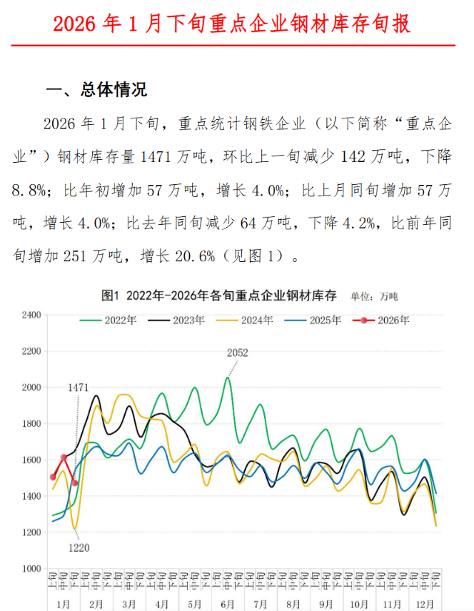 新华财经北京2月5日电中国钢铁工业协会5日公布的数据显示,2026年1月下旬,重点统计钢铁企业(以下简称“重点企业”)钢材库存量1471万吨,环比上一旬减少142万吨,下降8.8%;比年初增加57万吨,增长4.0%;比上月同旬增加57万吨,增长4.0%;比2025年同旬减少64万吨,下降4.2%,比2024年同旬增加251万吨,增长20.6%。