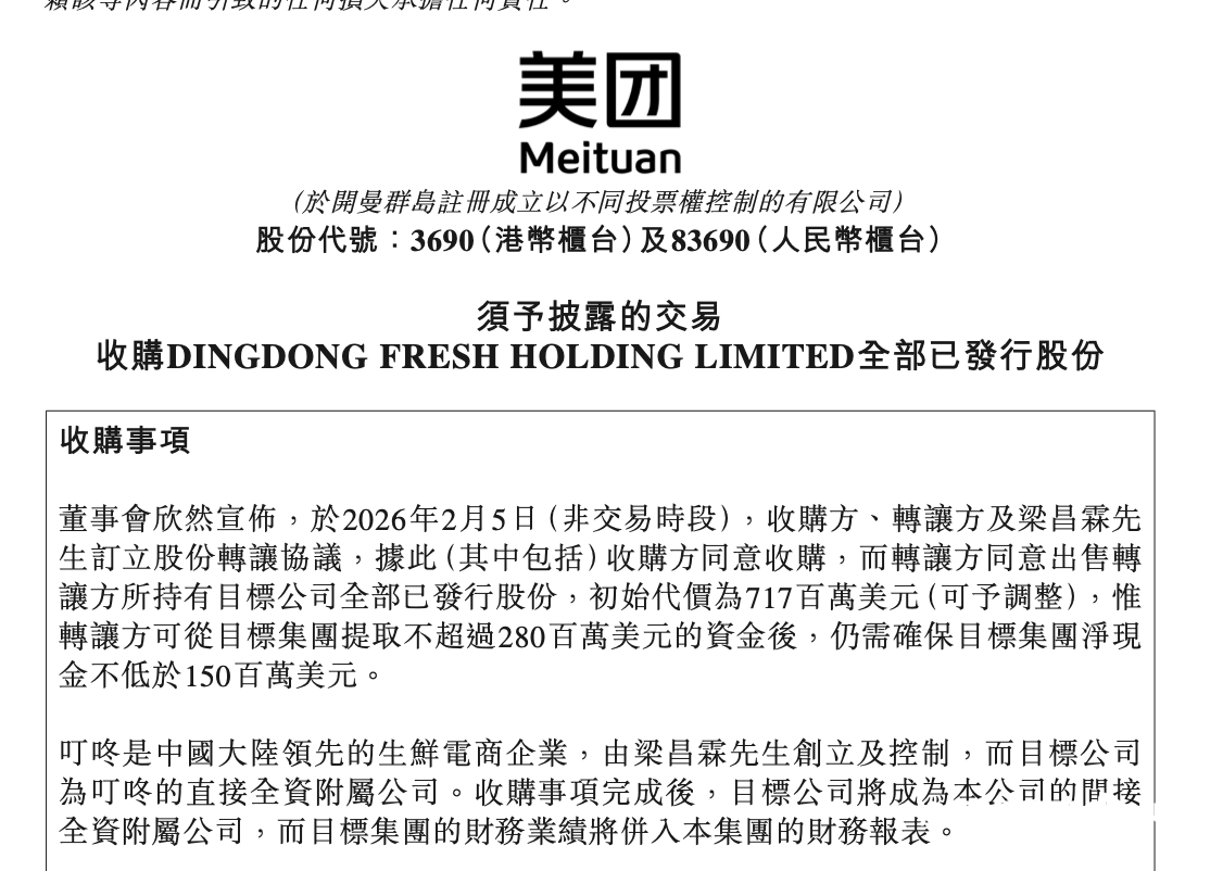 2月5日,美团发布公告称,美团已经与叮咚买菜及其创始人梁昌霖签订了股份转让协议,拟以7.17亿美元(约合人民币49.89亿元)的初始代价收购叮咚买菜中国业务100%的股权。此次交易,叮咚买菜的估值为10.06亿美元,收购完成后,叮咚买菜将成为美团的间接全资附属公司,其财务业绩将并入美团的财务报表。