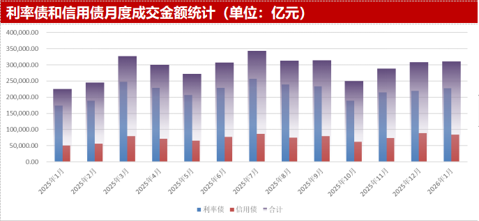 按类型划分,利率债方面,1月成交金额227,087.36亿元,同比、环比分别增长30.40%、3.34%,展现出较强的交易韧性。信用债(剔除同业存单)方面,1月成交金额83,606.03亿元,同比增幅达64.88%、但环比减少6.02%,成为债市整体交投热度降温的主要因素。