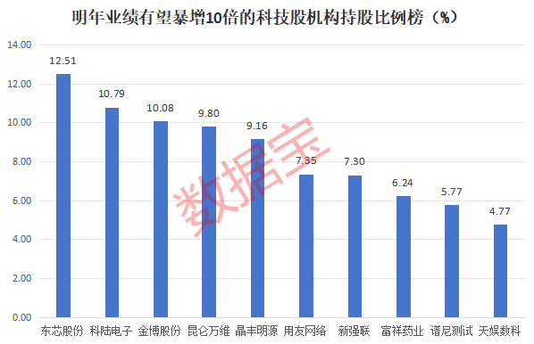 据证券时报·数据宝统计,根据机构一致预测,有17只科技股明年净利将暴增10倍。其中,谱尼测试以其大型综合性检测机构的身份,预计明年净利增速位居第一。蓝盾光电则致力于高端分析测量仪器研制,明年净利增速预计达35倍。