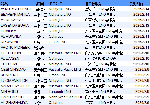 表2:2月9日-2月15日中国LNG进口预测