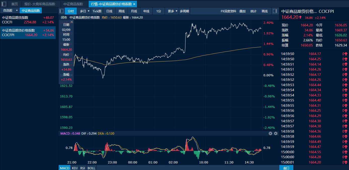 截至9日下午收盘,中证商品期货价格指数收报1664.20点,较前一交易日上涨34.86点,涨幅2.14%;中证商品期货指数收报2294.88点,较前一交易日上涨48.07点,涨幅2.14%。