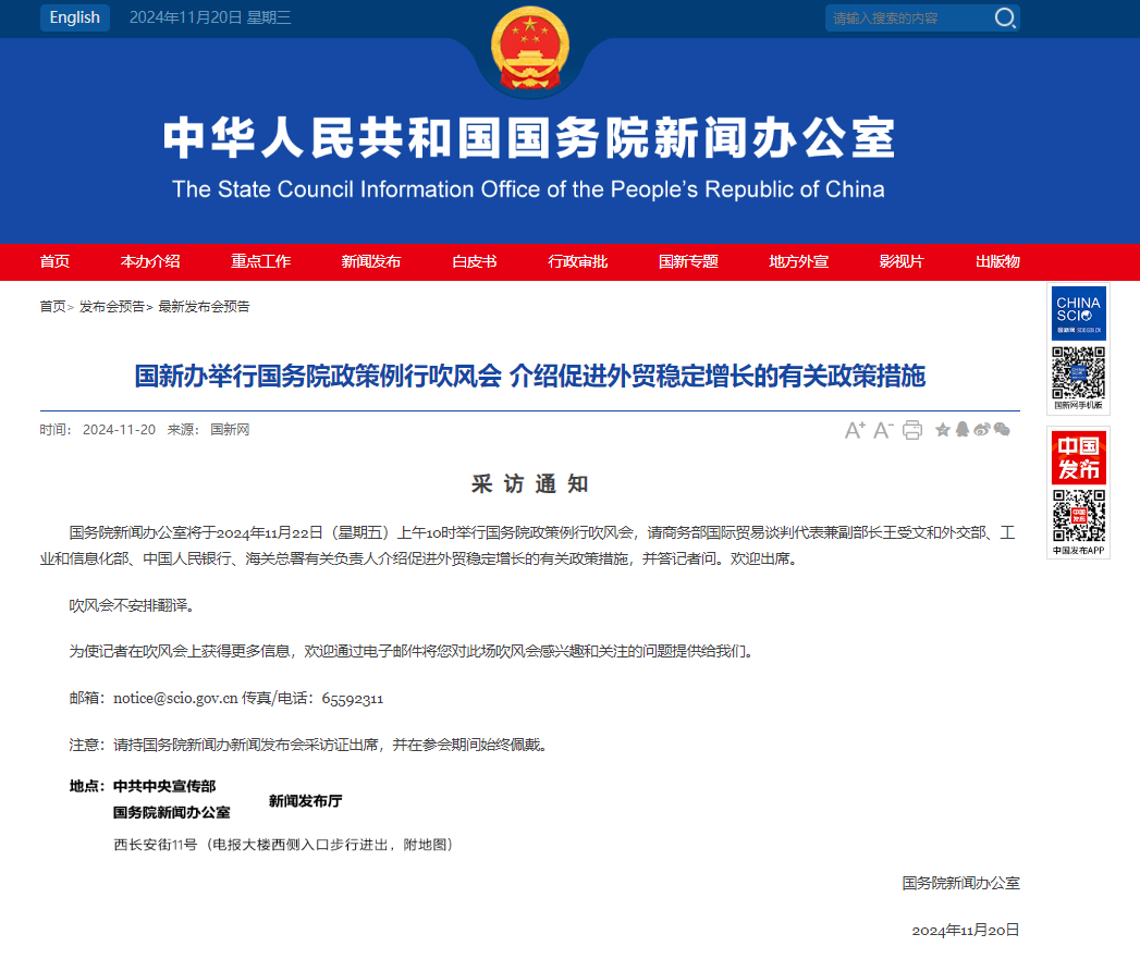国务院新闻办公室将于2024年11月22日举行吹风会,商务部等部门负责人将介绍促进外贸稳定增长的有关政策措施,并答记者问。