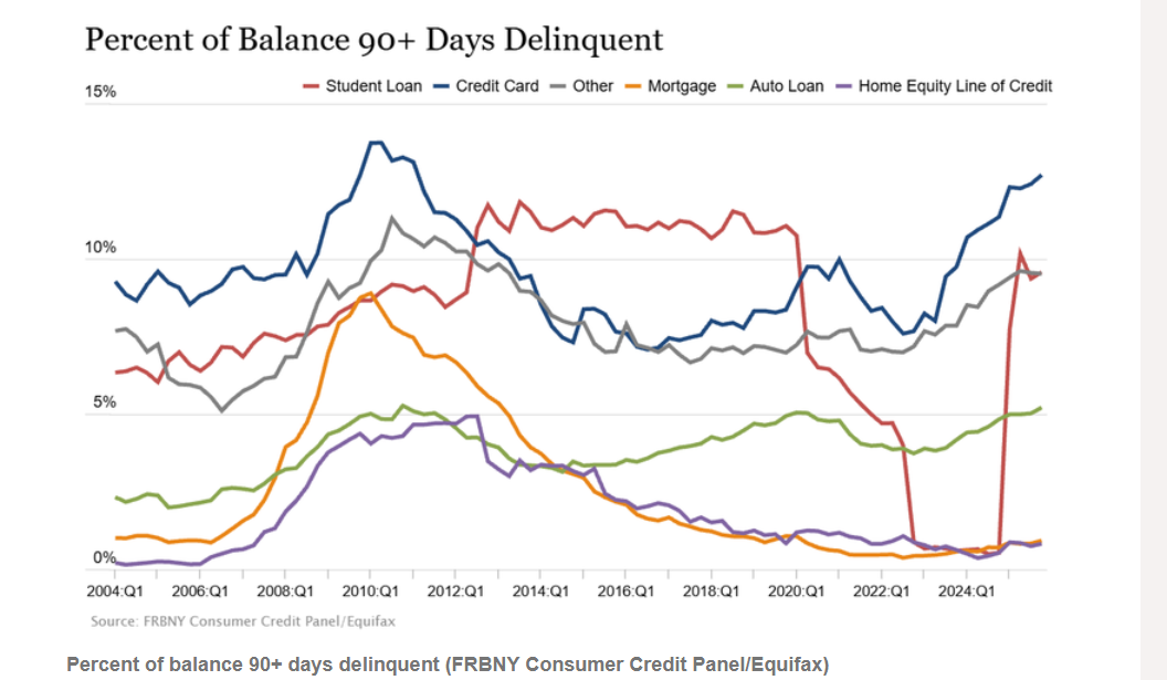 纽约联邦储备银行发布的最新报告显示,美国家庭总债务增加,消费者信贷违约率攀升至近十年来的最高水平。房地产市场继续推动债务增长,住房贷款净值连续第15个季度实现增长。此外,学生贷款债务未偿还额达1.66万亿美元,逾期率高达9.6%。