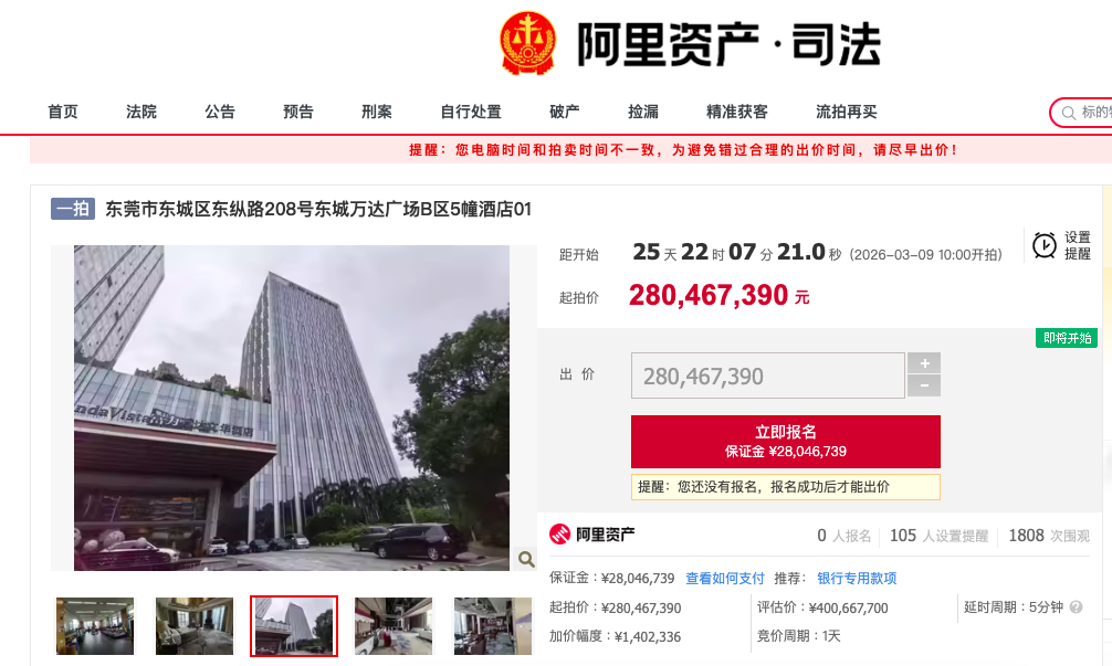 红星资本局2月11日消息,阿里资产司法拍卖平台显示,位于东莞市东城区的富力万达文华酒店将于一个月后进行整栋拍卖,起拍价约2.8亿元,评估价4亿元,相当于7折起拍。参与拍卖需缴纳保证金约2805万元,截至目前,有超过1800次围观,但无人报名。