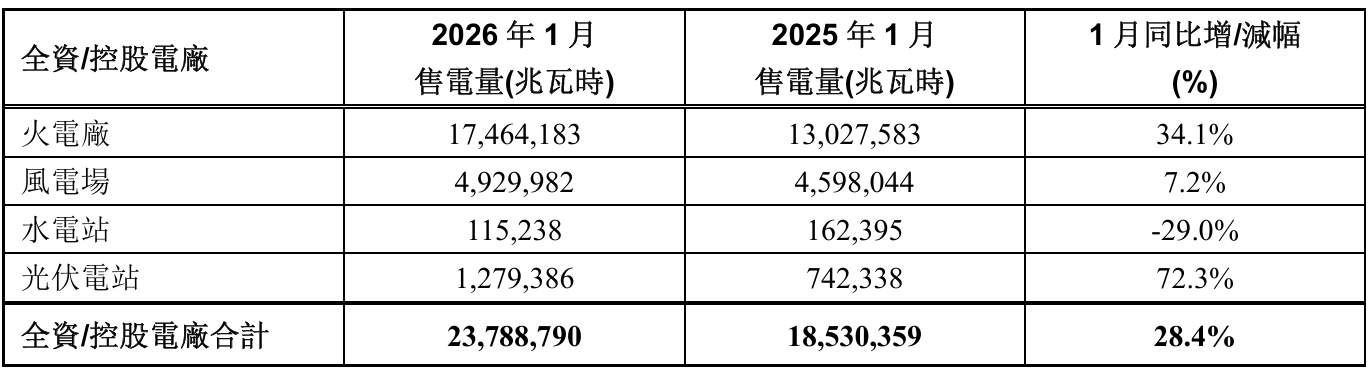 华润电力1月售电量同比增长28.4%