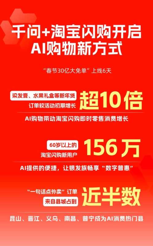 2月12日,千问App公布“春节30亿大免单”第一波活动数据:过去6天,用户说了41亿次“千问帮我”,AI完成下单超1.2亿笔。而淘宝闪购数据显示,来自千问的订单中,近半数在县城下单,更有156万名老年人通过千问首次体验外卖服务。AI技术在带动消费体验升级的同时,正全面激发各类人群、各线城市的新消费活力。