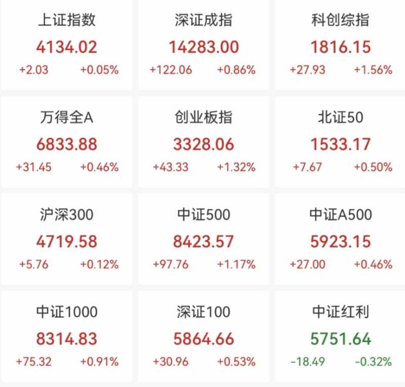 今日(2月12日),A股全天窄幅震荡。截至收盘,沪指小幅上涨0.05%,最新报4134.02点;深证成指上涨0.86%;创业板指上涨1.32%。全天成交21607.71亿元,较昨日放量1597.28亿元。