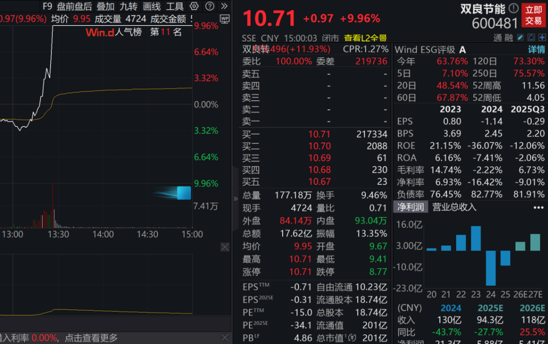 今日午后,双良节能直线拉涨停,截至收盘,仍有21.73万手封死涨停。该股最新价10.71元/股,总市值为200.68亿元。