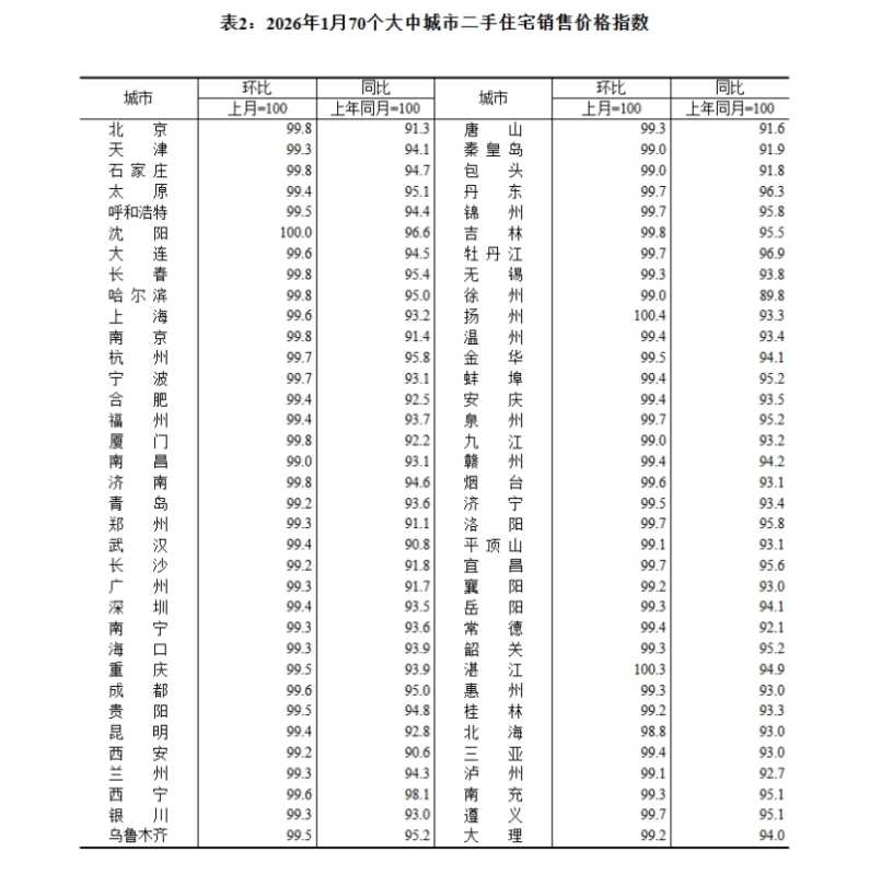 表2:2026年1月70个大中城市二手住宅销售价格指数