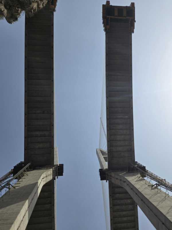 樊克锋介绍,大桥索塔已于2025年4月封顶,主梁采用牵索挂篮工艺,施工正稳步推进,右幅已完成15个块段浇筑,左幅已完成14个块段,主梁整体完成61%。
