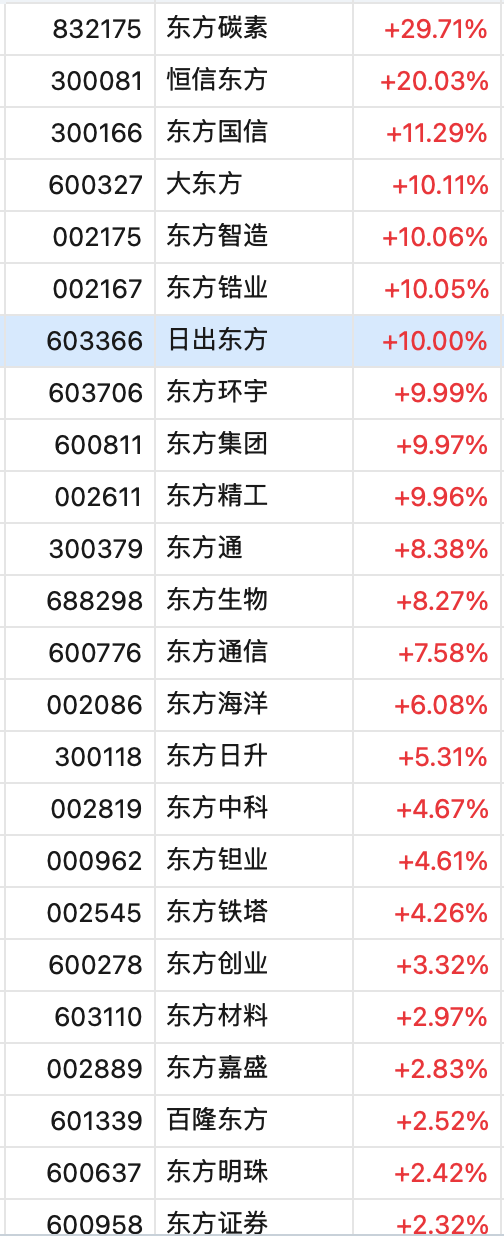 值得注意的是,今日市场中多只简称带有“东方”字样的个股连续涨停,引发市场关注。其中,日出东方(603366.SH)在近13个交易日内收获了11个涨停板,上演“地天板”行情。东方精工(002611.SZ)也连续第5日一字涨停,股价创下8年多来的新高(复权)。受此影响,名称中含有“东方”的个股普遍受到资金追捧,恒信东方20%涨停,东方碳素涨超29%,大东方、东方智造、东方锆业、东方环宇、东方集团等多股涨停。