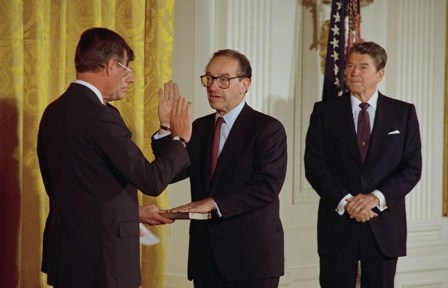 作为背景,格林斯潘1987年接替保罗·沃尔克出任美联储主席,先后获得里根、老布什、克林顿、小布什四任总统提名连任,最终于2006年初交班给伯南克。