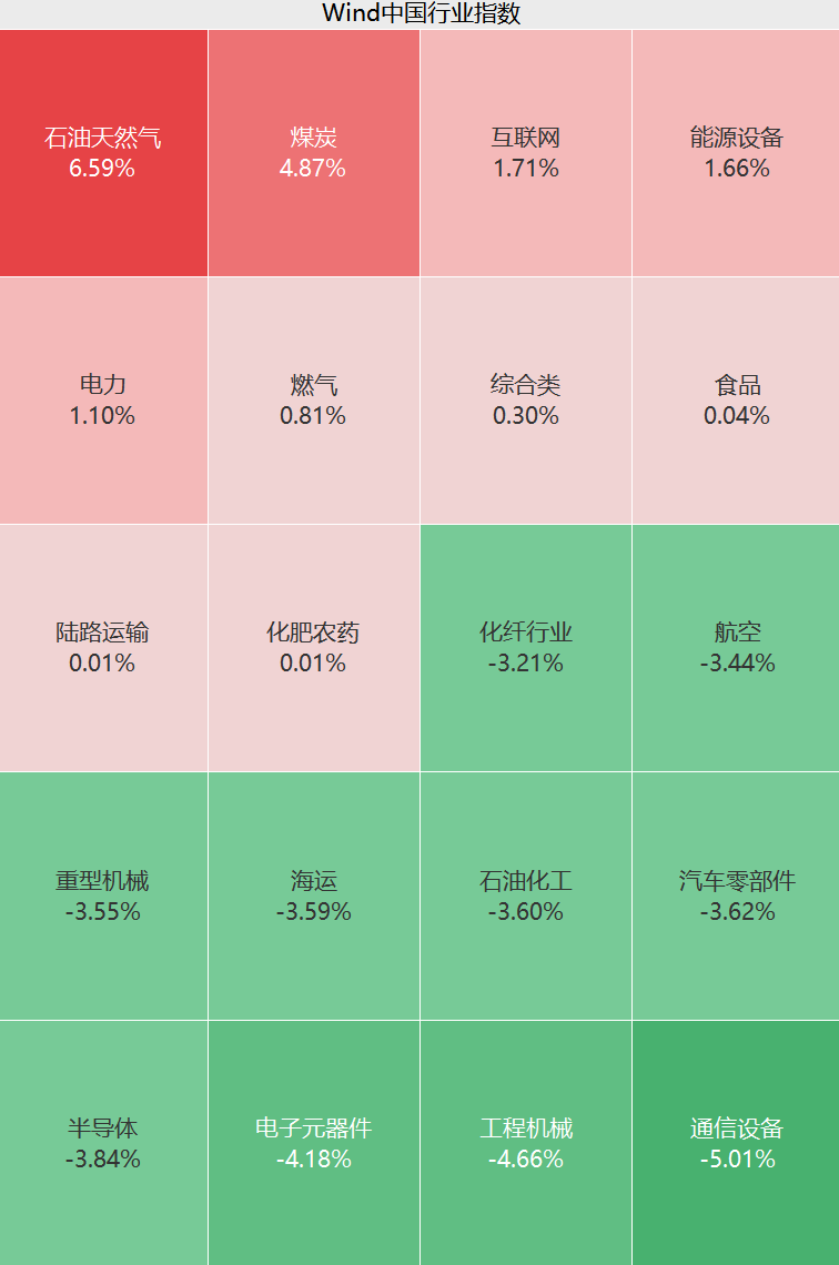 行业板块上,上午通信、电子板块领跌,机械设备、建筑材料、国防军工等领域走低,光模块、光通信概念股大跌;煤炭、石油板块逆市走强。