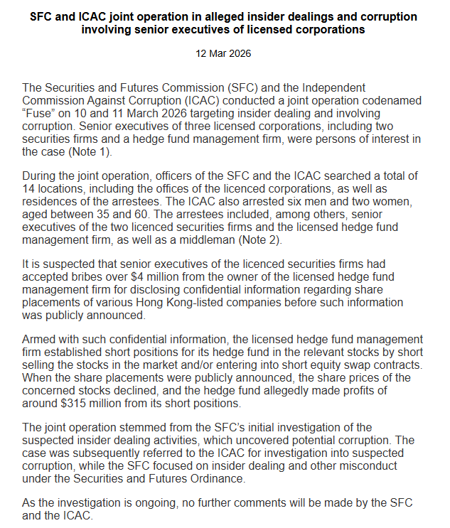 3月12日,记者从香港证监会了解到,香港证监会与香港廉政公署于2026年3月10日及11日联合展开代号为“Fuse”的行动,针对内幕交易及涉嫌贪污行为进行调查。两家证券公司、一家对冲基金管理公司等三家持牌机构高级管理人员为本案相关人士。